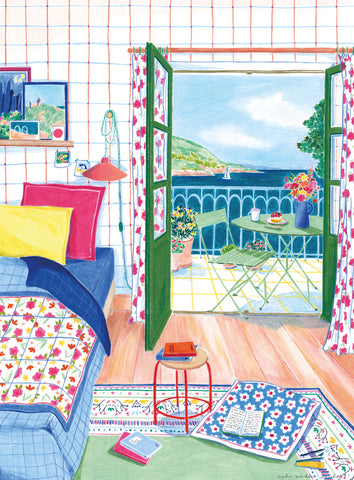 Un lit moelleux, un bon livre, un goûter sur le balcon… et la mer à l'horizon. Ce puzzle 500 pièces capture un moment de calme absolu, baigné de lumière et de sérénité. L'évasion commence dès la première pièce.