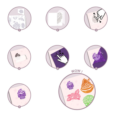 Ce kit propose de décorer 12 cartes illustrées sur le thème des desserts avec des patchs de colle et des feuilles pailletées aux couleurs douces. L’enfant choisit un patch de colle parmi les motifs proposés et l’applique sur la carte de son choix. Il choisit une feuille pailletée, puis la dépose sur le patch collant. La forme du patch est alors révélée en couleurs et scintille ! Ce coffret fait partie de la gamme Artistic Patch proposant différentes textures à coller pour varier les plaisirs !