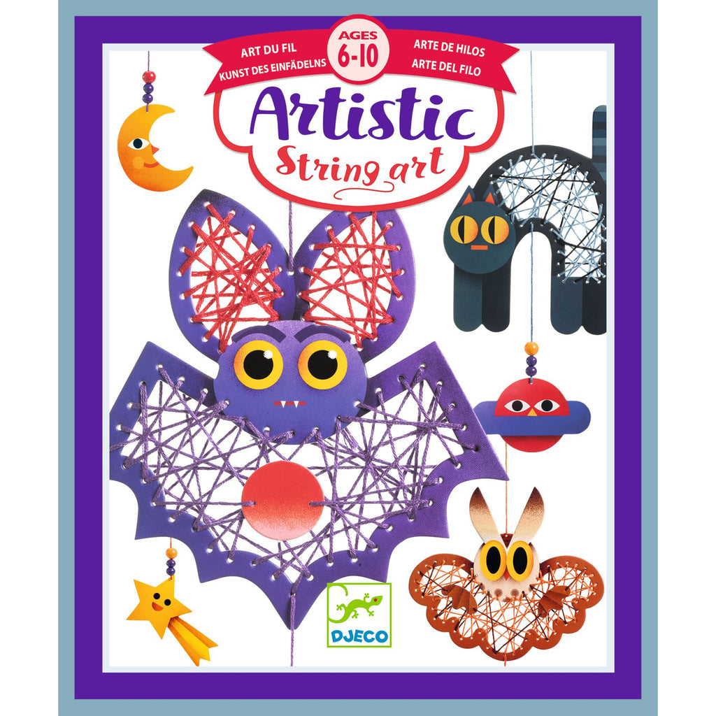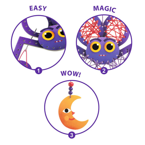 Un kit pour créer 3 suspensions décoratives « nocturnes ». À l'aide de l'aiguille à bout rond, l’enfant glisse les fils dans les cartes perforées et les croise jusqu’à donner corps aux personnages à compléter. Il vient finaliser ses créations en ajoutant des pendentifs avec des perles en bois.