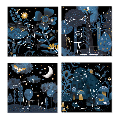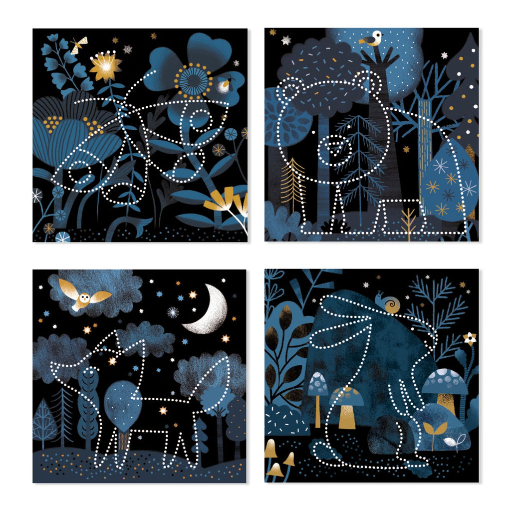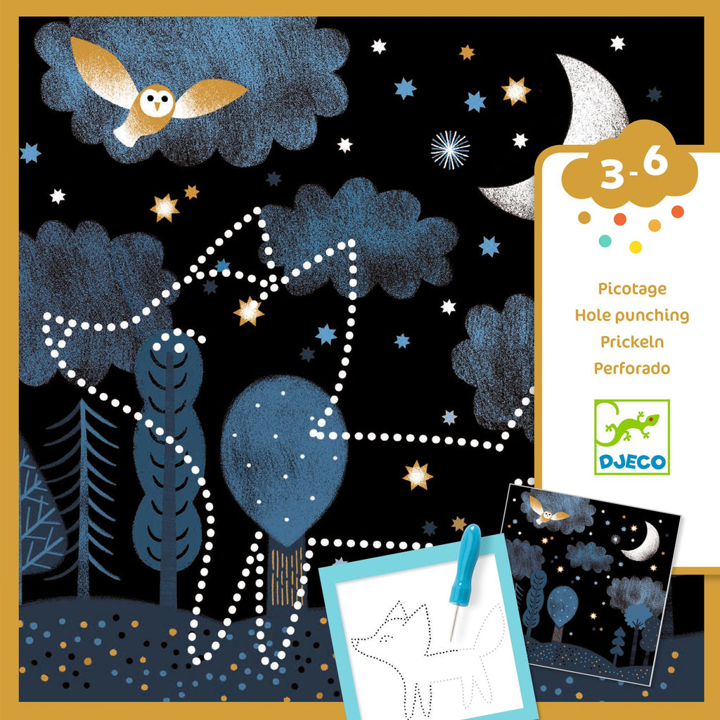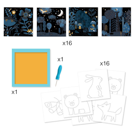 L’enfant choisit un fond et l’animal qui va apparaître. Il bloque ensuite les 2 feuilles dans le support. À l’aide de l’outil, il picote en suivant les points des trames. L’enfant place une source lumineuse derrière son fond : surprise, l’animal apparait.