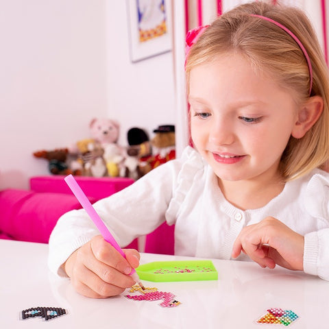 Avec le kit créatif Stickers à Diamanter, réalisez de superbes stickers en forme d'ananas, de licorne, de fraise, et même de glace !