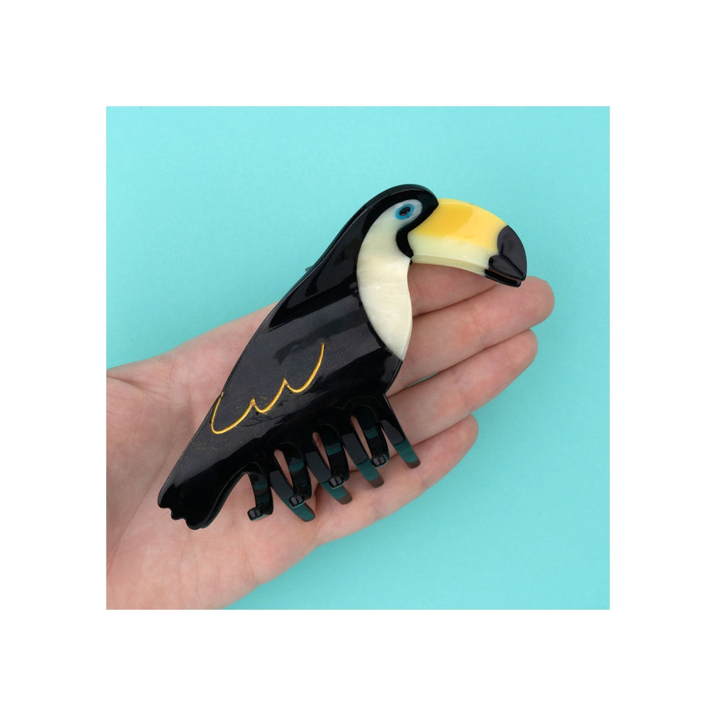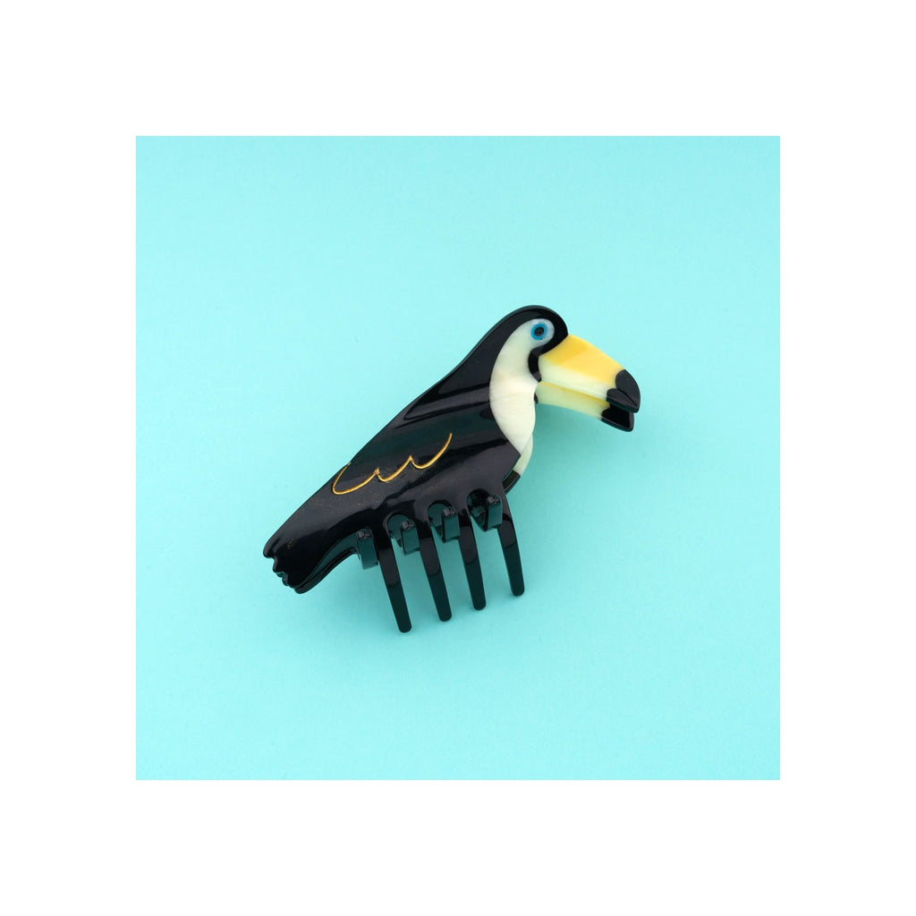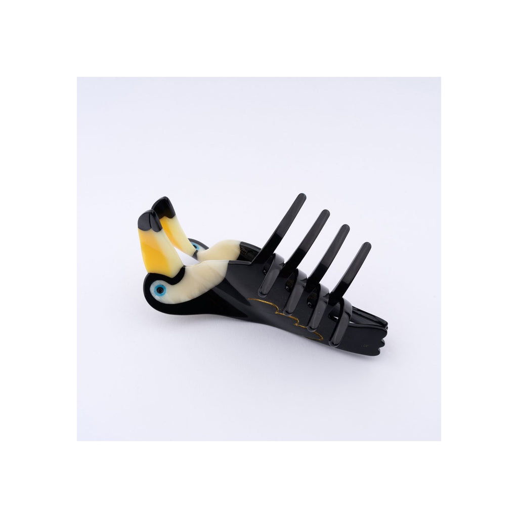 Donnez de la hauteur à vos coiffures avec notre grande pince à cheveux Toucan! Son design graphique en plumage noir et blanc, associé à son bec jaune-orangé époustouflant, apportera une touche tropicale et décalée à tous vos looks. Sa grande taille et ses dents en acétate vous permettront de dompter même les crinières les plus rebelles. Attention, ne pas l'utiliser dans l'eau !