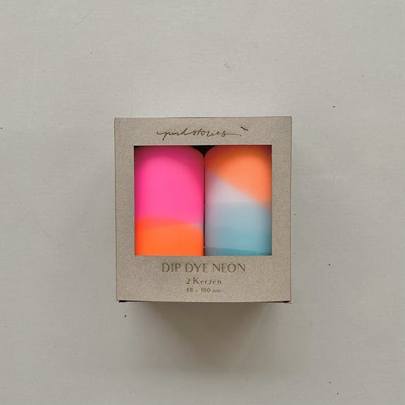 Ensemble de deux bougies au look néon joliment colorées à la main. Les couleurs restent les mêmes, les motifs varient avec chaque bougie et les rendent uniques. Coloré dans une institution sociale dans les magnifiques contreforts des Alpes.