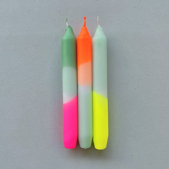 Ensemble de trois bougies coniques joliment colorées à la main dans un look néon. Les couleurs restent les mêmes, les motifs varient avec chaque bougie et les rendent spéciaux.