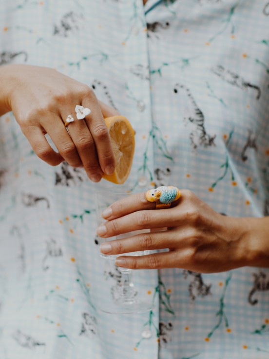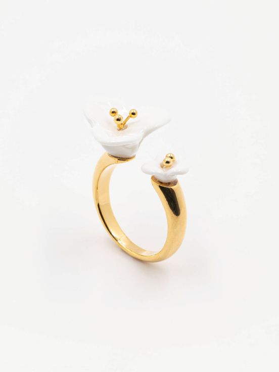 Bague ajustable en porcelaine et laiton doré à l’or fin. Métal certifié sans nickel et sans risque d’allergie.