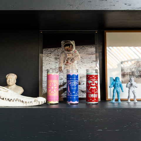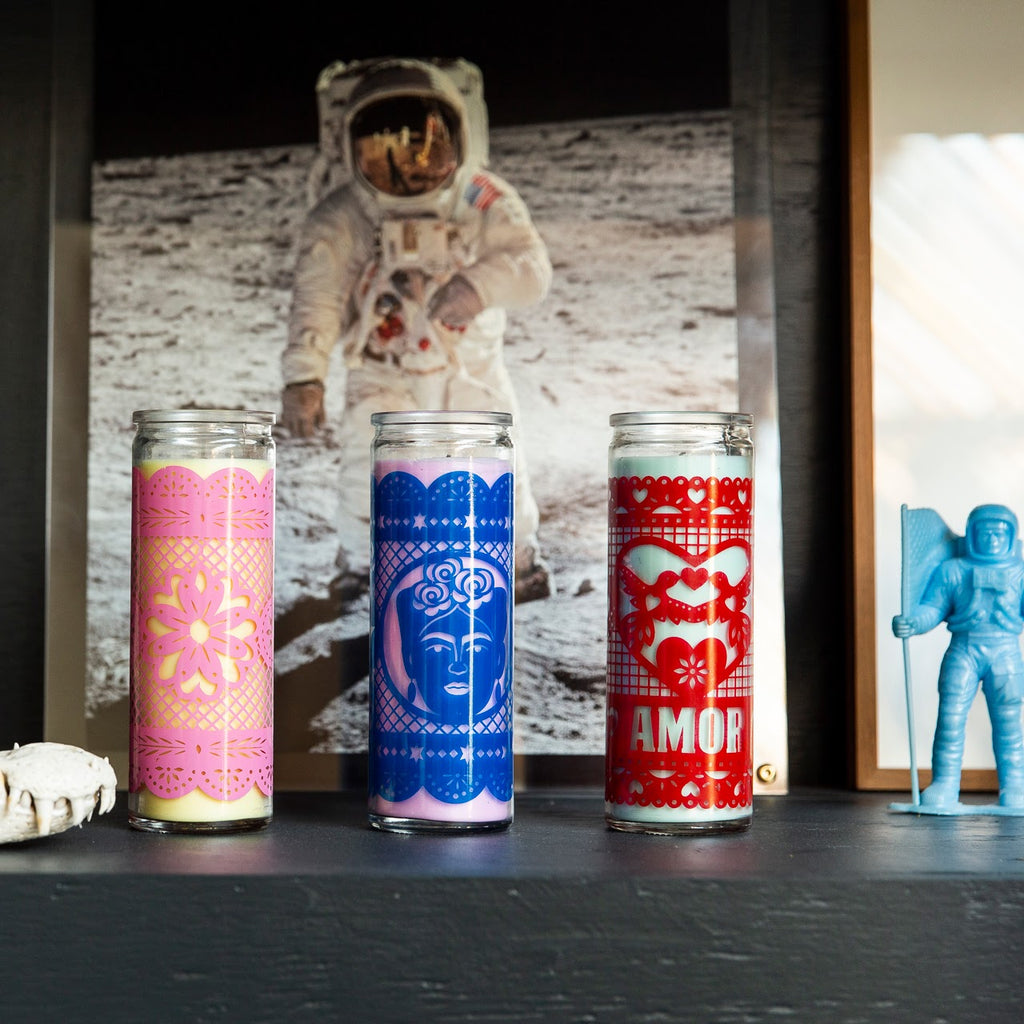 Les bougies en verre Papel Picado Frida sont rose clair dans un pot en verre et s'inspirent du Papel Picado : c'est un art décoratif mexicain réalisé en découpant des motifs dans des feuilles de papier de soie.