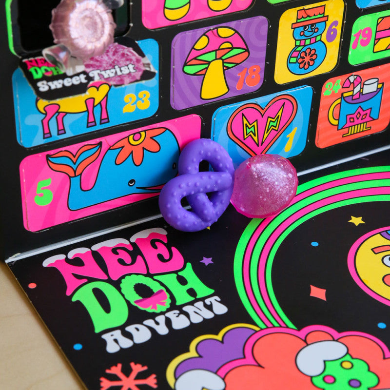 Les calendriers de l'Avent font partie des traditions de Noël depuis des décennies, mais la version Nee Doh apporte une touche de nouveauté et de tactilité. Au lieu de chocolats ou de babioles, chaque jour révèle un jouet miniature de la célèbre gamme Nee Doh : de petites boules, cubes et formes conçues pour être pressées, étirées et malaxées.