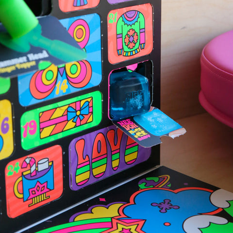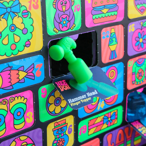 Il comprend des versions miniatures des jouets Nee Doh les plus populaires : petits globes, cubes sympas, fruits groovy et autres motifs thématiques exclusifs au calendrier.