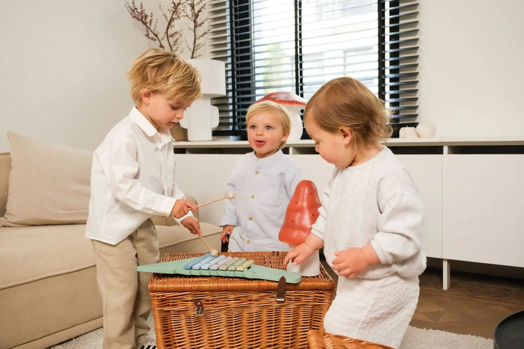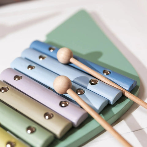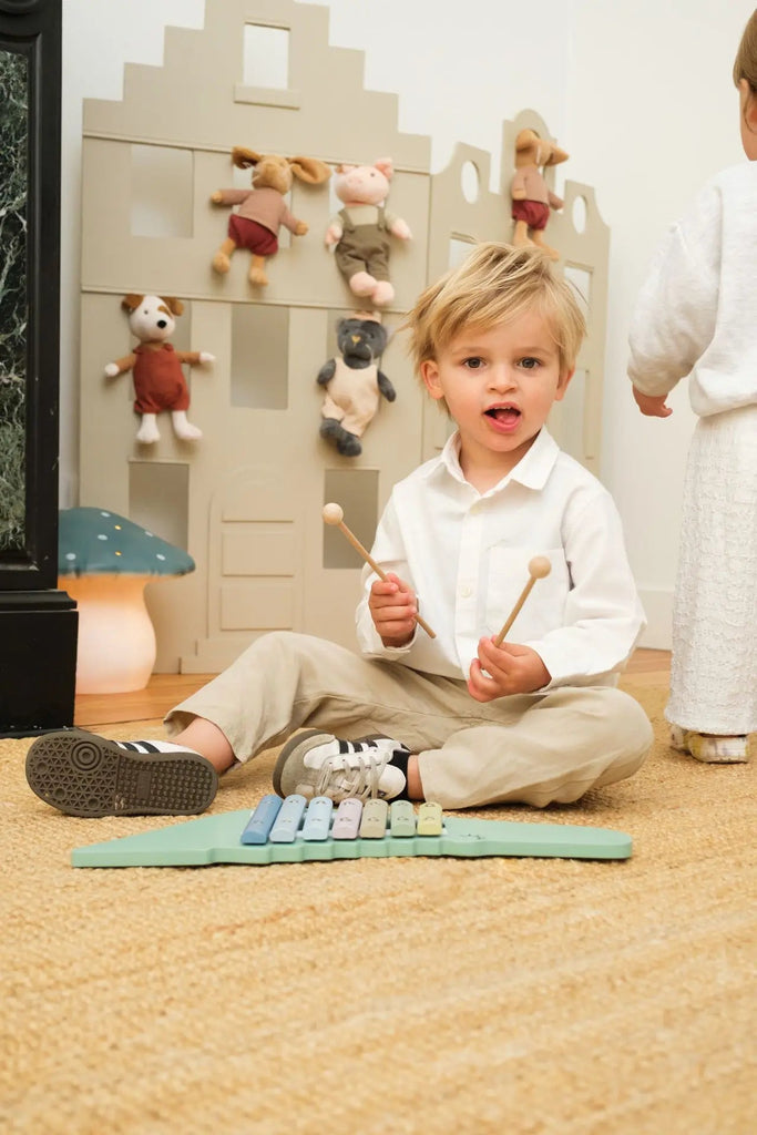 Les petits doigts 🖐️ tapent sur les barres colorées et voilà que la pièce s’illumine de jolies notes 🎶 ! Ce xylophone crocodile 🐊 en bois offre 8 barres métalliques scintillantes et 2 maillets en bois doux pour jouer en toute convivialité. Parfait dès 18 mois, il stimule le rythme et la coordination tout en respectant les oreilles sensibles 👶. Un premier compagnon musical à chérir, pour éveiller la curiosité et partager de belles aventures sonores ensemble 🌟🎵!
