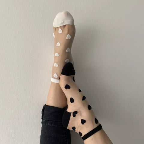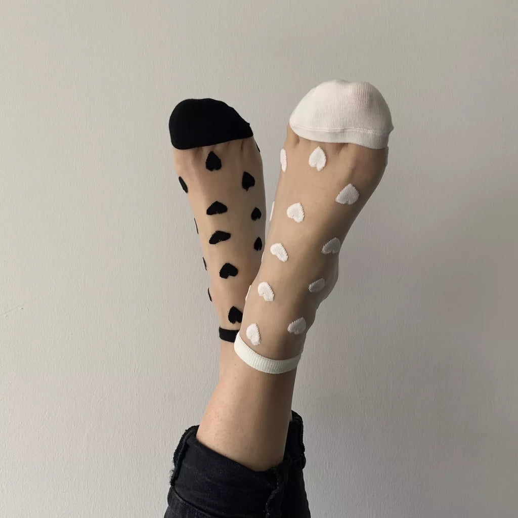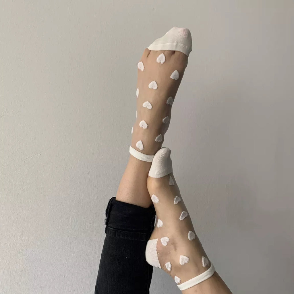 Une jolie paire de chaussettes transparentes avec de petits cœurs. Des chaussettes mignonnes qui peuvent assorties avec vos baskets, bottines ou même vos escarpins…