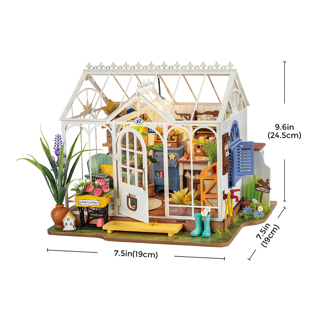 Découvrez notre miniature haut de gamme d'inspiration européenne d'une maison de jardin, qui comprend des détails complexes de jardinage, de structure et d'objets, remplis de charme et de verdure, offrant une expérience réaliste de jardinage domestique. Il comprend un magnifique lustre fleuri, une serre panoramique, des portes et fenêtres élégantes, des outils de jardinage et des meubles classiques en bois.