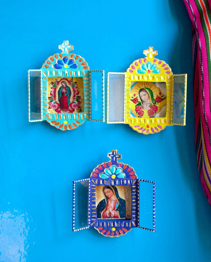 Petite niche avec deux portes vitrées en 3 couleurs assorties vient s’ajouter à la collection de niches mexicaines de Tienda Esquipulas.