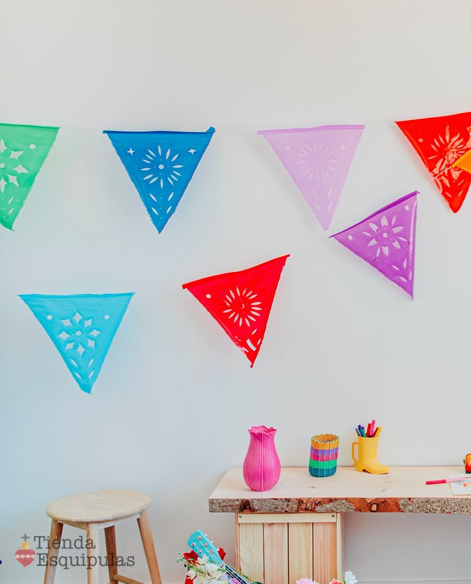 Pour créer une fiesta mexicaine réussie ! Décorez et donnez un aspect chaleureux à vos fêtes d’anniversaires, mariages. Décoration Guirlande en plastique longue de 8 mètres. Décoration “papel picado” typique mexicain entièrement fait main.
