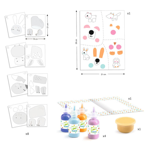Une première activité de peinture dès 18 mois. L’adulte détache les formes et met de la peinture dessus. Au tour de l’enfant de mettre ses mains dans la peinture et de badigeonner les formes : on dit qu’il patouille ! Il assemble ensuite les formes et colle des autocollants. Il crée 4 animaux vraiment jolis en 2D.