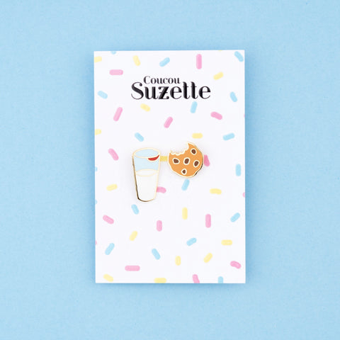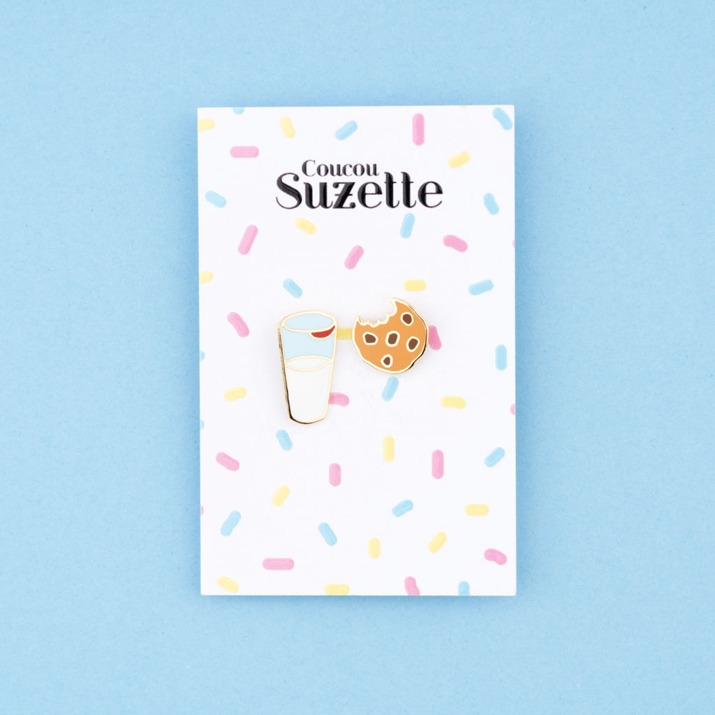 Un duo de pin’s à croquer, avec son cookie entamé et sa trace de rouge à lèvre sur le verre de lait. Parfait pour pimper son gros manteau d’hiver pas toujours très saillant !