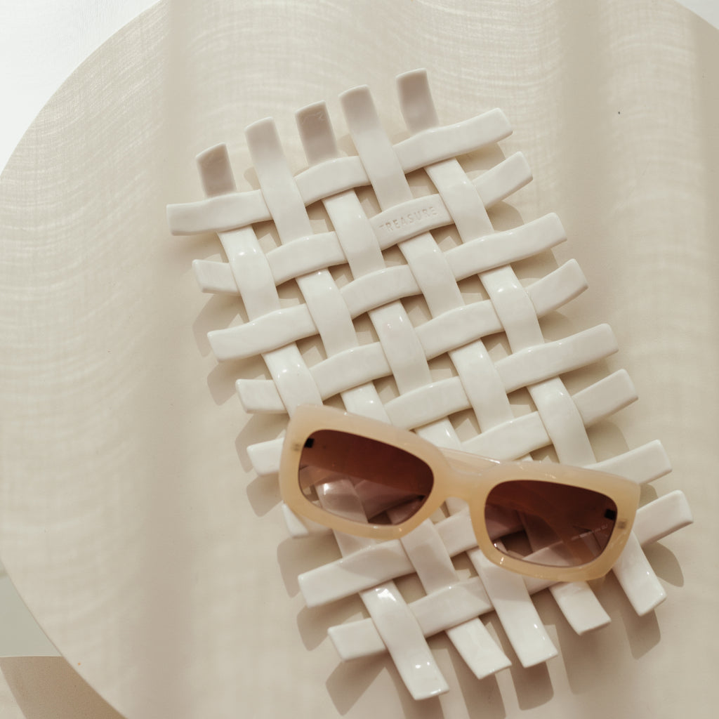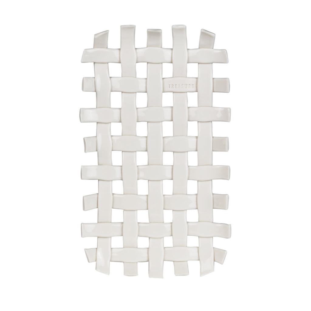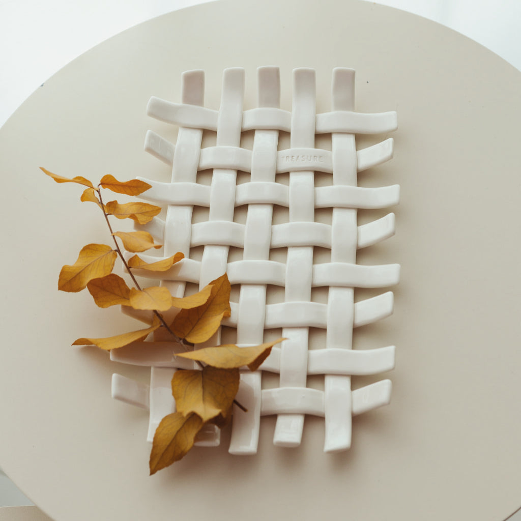 Nous avons ici une corbeille tressée à la main qui peut remplir tous vos rêves! Elle est faite de porcelaine lourde et robuste, et se prête parfaitement à la fonction de vide-poche, plateau à trésor, porte bijoux ou plus encore! Une belle piece qui vous servira des années durant sur une table pour le déjeuner, ou un chevet, voire l'entrée...!