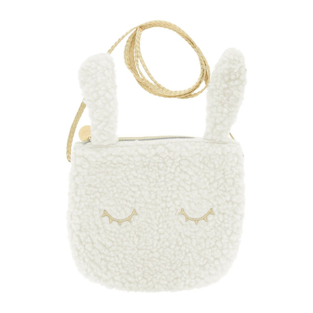 Ce petit sac à bandoulière en forme de tête de lapin est équipé d'une fermeture à glissière dorée et d'une bandoulièreB tressée assortie.