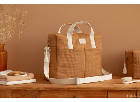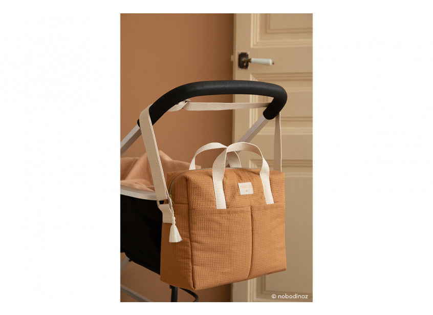 Le sac Gala en coton bio a le format idéal et s'accroche à la poussette. C'est le sac parfait pour vos sorties quotidiennes en famille. Son intérieur imperméable équipé de deux poches vous permettra de ranger tout le nécessaire pour votre bébé. Vous pourrez aussi glisser dans les deux poches extérieures les petits détails que vous aimez garder à portée de main. Grâce à son système de double anses en tresse de coton, vous pouvez le porter à la main, à l'épaule ou encore l'accrocher à la poussette pour plus de liberté. Notre nid d’abeille 100% coton bio est raffiné, élégant et résistant, idéal pour les affaires de maternité. Le dessin du nid d’abeille est exclusif, conçu en collaboration avec nos tisseurs barcelonais.
