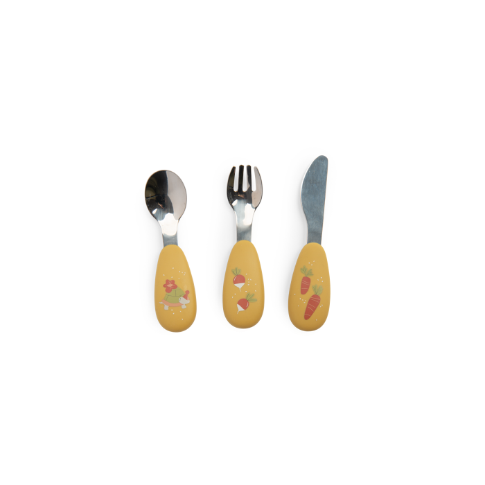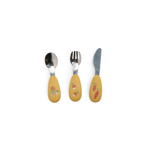 Set de 3 couverts en inox et silicone pour une bonne prise main pour manger comme les grands ! Ils sont joliement illustrés aux couleurs des 3 petits lapins.