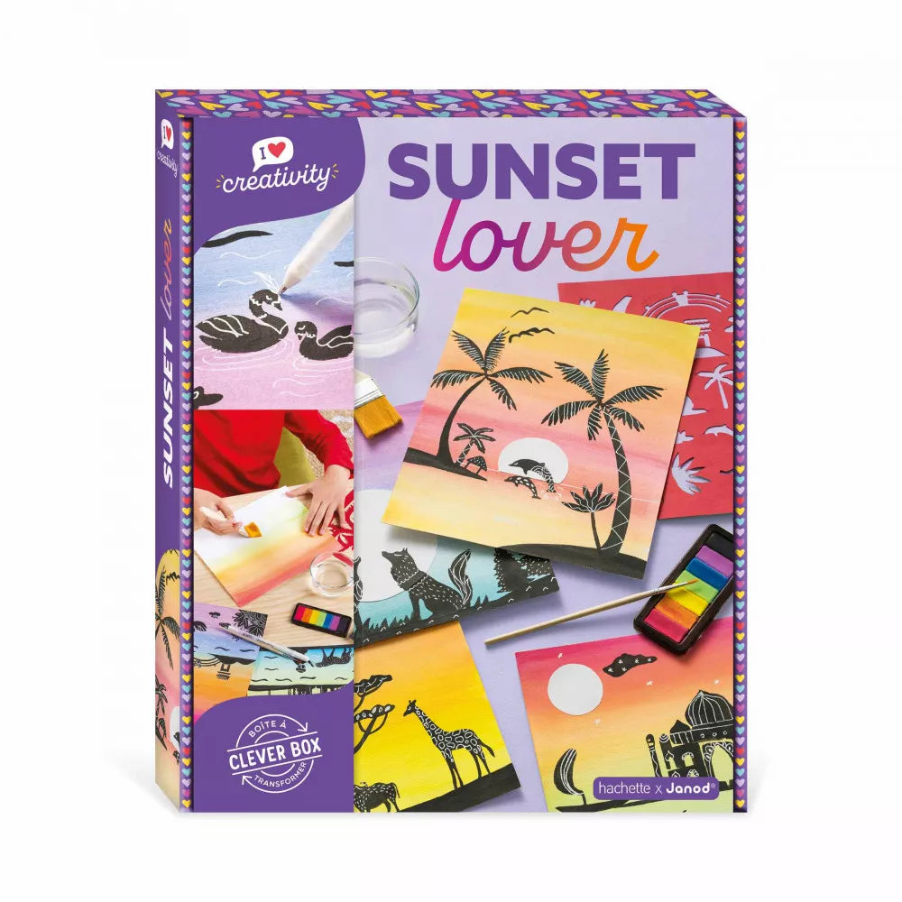 Brillez sous le soleil avec le Coffret Créatif Peinture Sunset Lover ! Avec ce kit créatif, les enfants à partir de 8 ans peuvent créer 5 tableaux de coucher de soleil aux ambiances dégradées, avec des dessins de silhouettes noires en avant-plan. La boîte même sert de cadre pour une de leurs réalisations. Un guide d'utilisation, 2 pinceaux, une palette de 7 couleurs aquarelles, 2 planches de pochoirs et un stylo blanc sont inclus : c'est parti pour 6h à 7h30 de créativité et de motricité fine qui fera briller le soleil pour longtemps !