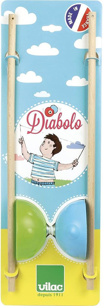 Diabolo avec ses deux baguettes en bois pour multiplier les figures. Fabrication française.
