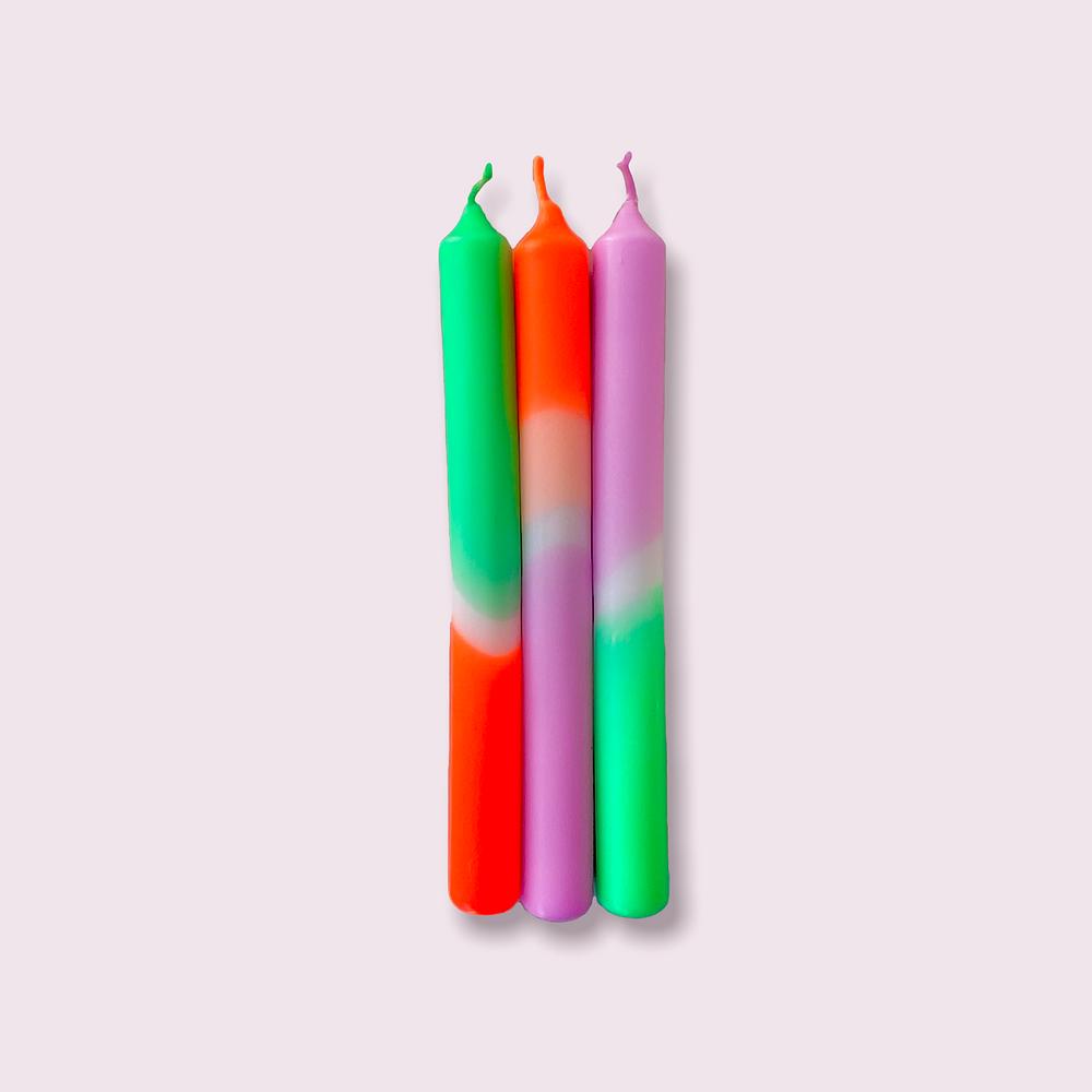 Ensemble de trois bougies au look néon joliment colorées à la main. Les couleurs restent les mêmes, les motifs varient avec chaque bougie et les rendent uniques. Coloré dans une institution sociale dans les magnifiques contreforts des Alpes.