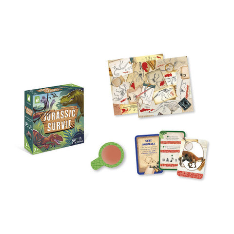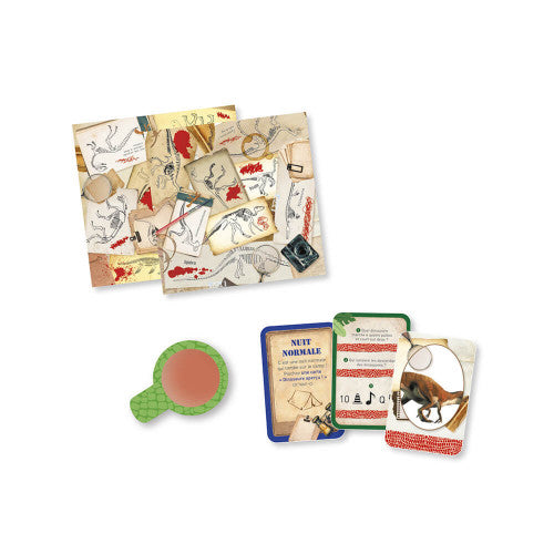 Ce jeu de survie coopératif (de 2 à 6 joueurs) se compose de 7 cartes "la nuit tombe", 30 cartes "dinosaures aperçus !", 13 cartes "attaque", 1 filtre rouge pour vérifier les réponses et de 2 posters "Identificateur de dinosaures".