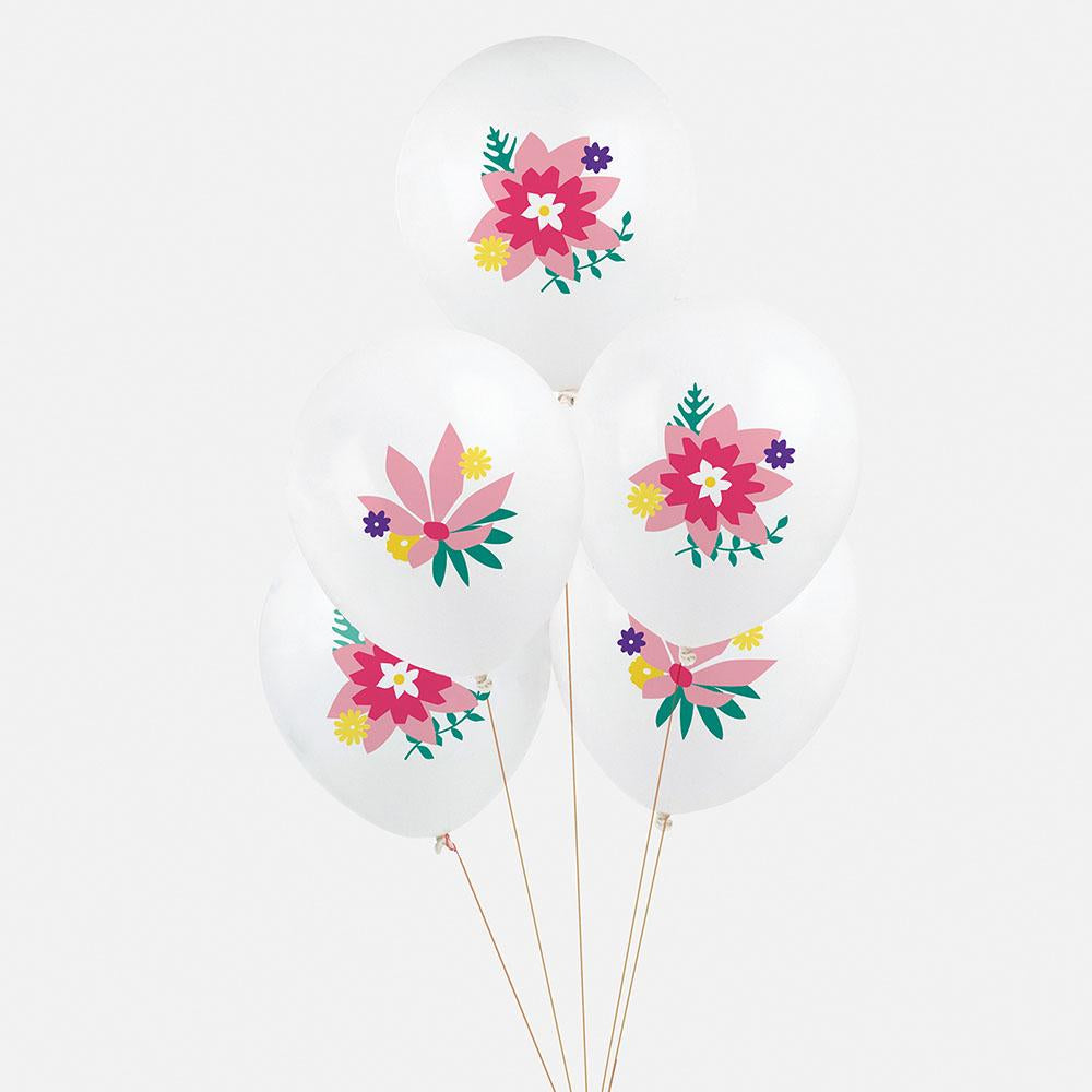 5 ballons anniversaire recouverts de fleurs à associer à la vaisselle fleurie, une guirlande fleurs, des toppers fleurs et évidemment des vraies fleurs à disposer dans des vases, à même la table, sur une couronne ou encore sur les murs ! N'hésitez pas à les associer avec d'autres ballons pour créer une arche de ballon estivale et colorée.