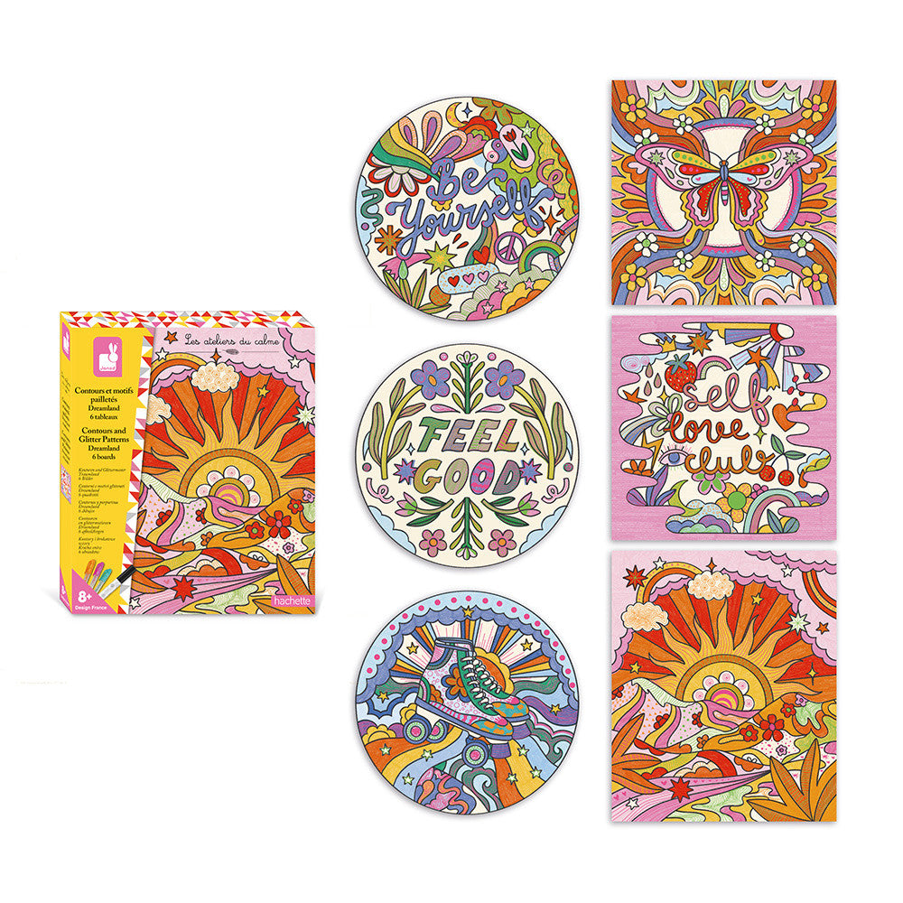 Ce coffret de loisir créatif contient : 2 tableaux rectangulaires (19,5x23,5 cm), 2 tableaux ronds (19,5 cm de diamètre), 2 tableaux carrés (19,5x19,5 cm), 3 mini stylos gel pailletés de couleur différente, 1 feutre acrylique noir. Un livret avec conseils et modèles est également fourni, idéal pour avoir un aperçu du résultat final.