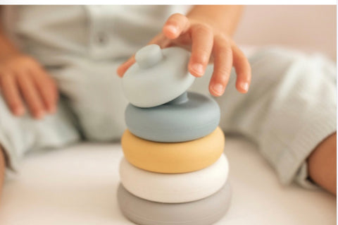 Minene vous présente une jolie version d’un jouet incontournable pour les enfants vers 1 an : une tour composée de 6 ronds en silicone, à empiler tout en faisant preuve de dextérité et de logique !
