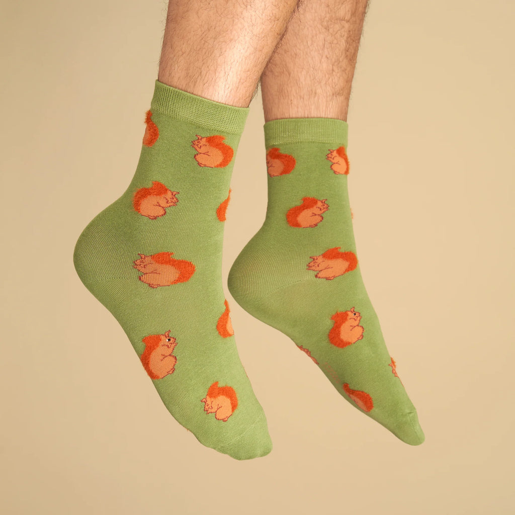 Ces chaussettes écureuil signées Coucou Suzette apportent une touche ludique à votre look d’automne. Avec leurs adorables motifs de petits écureuils roux, certains endormis, d’autres en mode chasse aux provisions, elles racontent une histoire charmante. Leur atout magique ? Une queue poilue toute douce qui dépasse joyeusement de vos baskets ou bottines. Parfaites pour égayer vos journées fraîches avec un clin d’œil espiègle à la nature