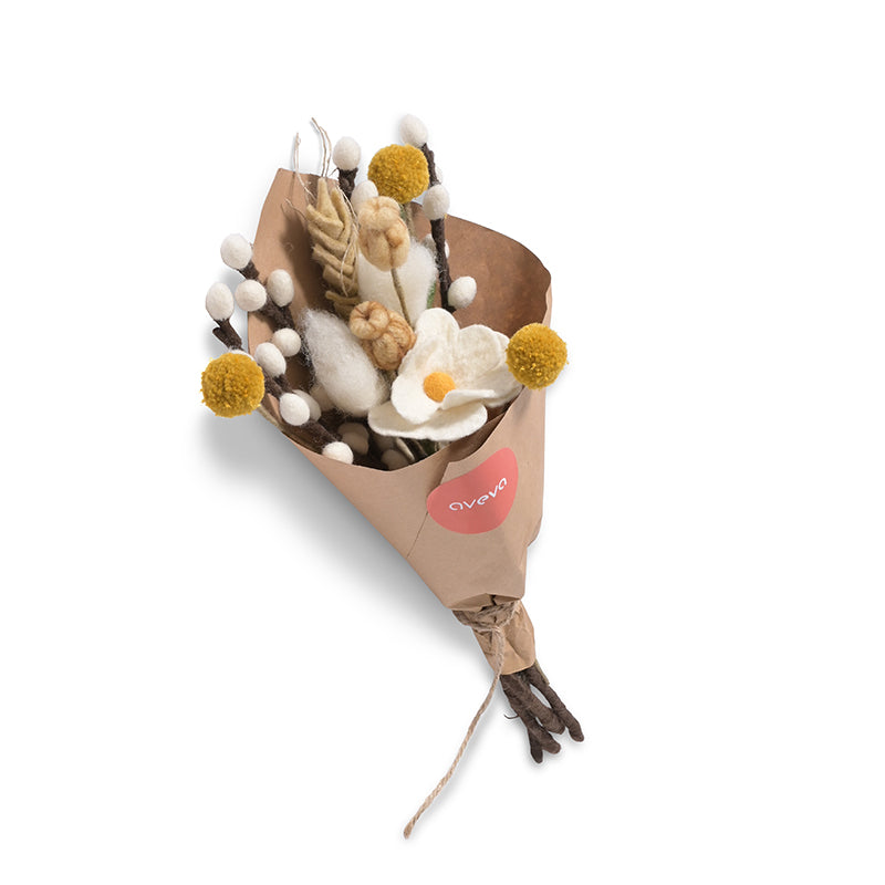 Ce bouquet de fleurs artisanales en laine est conçu pour durer éternellement et conserver sa beauté à travers les générations. Il se compose de 12 fleurs enveloppées dans du papier. Ce bouquet comprend les fleurs éternelles suivantes : Rose blanche, Fleur de Coton, Epi de blé, Craspedia, "Willow", "Seed case".