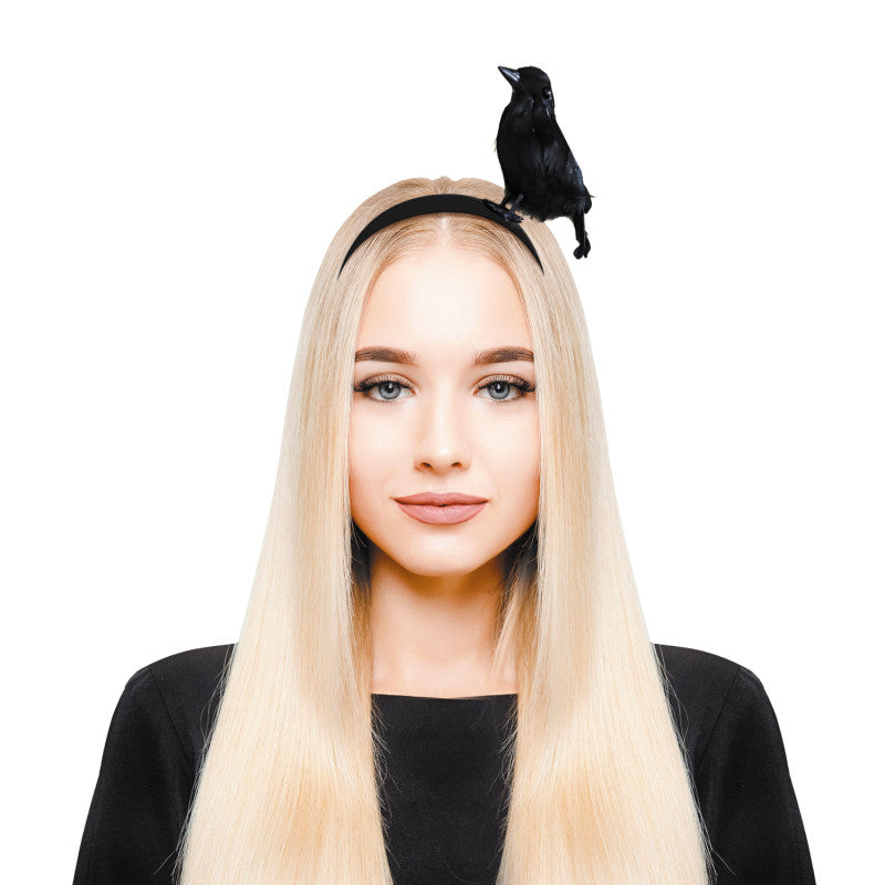 Le corbeau s’attache facilement au serre-tête grâce à une bande velcro. Un corbeau à plumes 🪶, l’accessoire parfait pour compléter un déguisement de sorcière 🧙♀️✨!