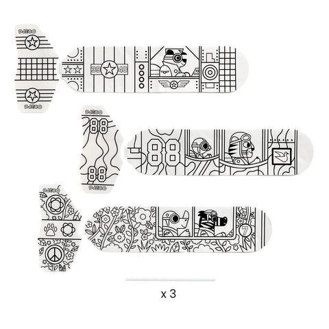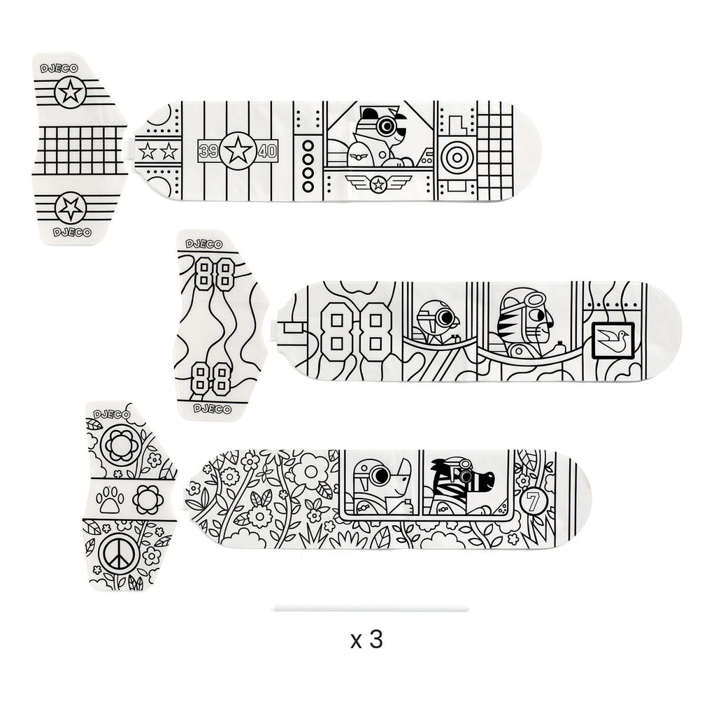 Un kit créatif avec 3 avions gonflables à colorier. Les avions se colorient simplement avec des feutres, se gonflent avec les pailles fournies, et volent dans les airs !