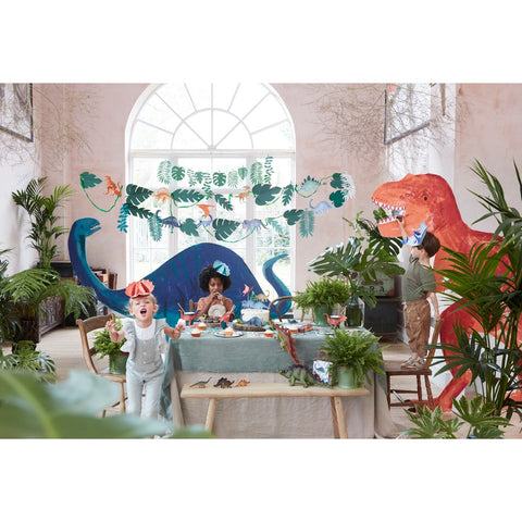 Roar, si vous organisez une fête de dinosaures, alors le garçon ou la fille qui fête son anniversaire, et ses invités, vont tout simplement adorer cette sensationnelle grande guirlande Dinosaur Kingdom. Elle comprend dix dinosaures magnifiquement illustrés et fabriqués, vingt fanions de feuillage et des serpentins en crêpe. Elle ajoutera certainement de l'ambiance !