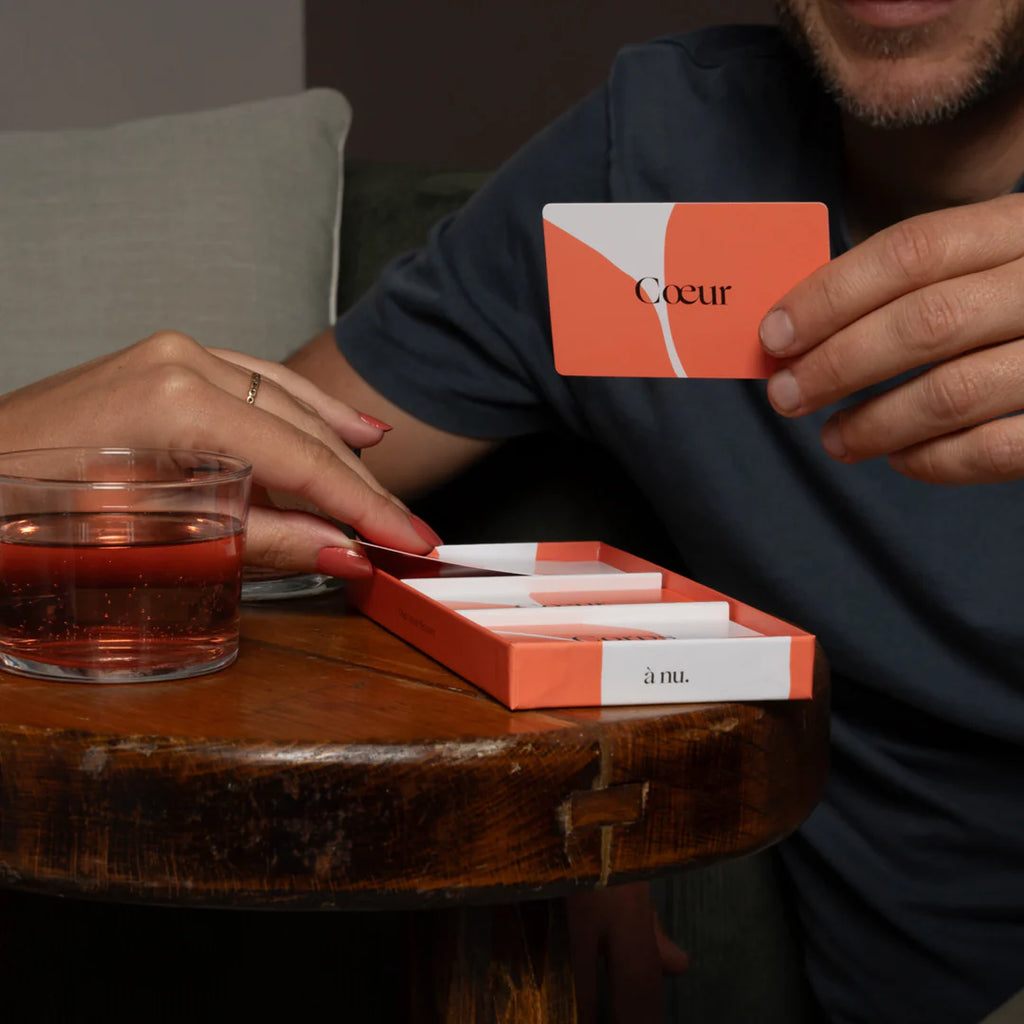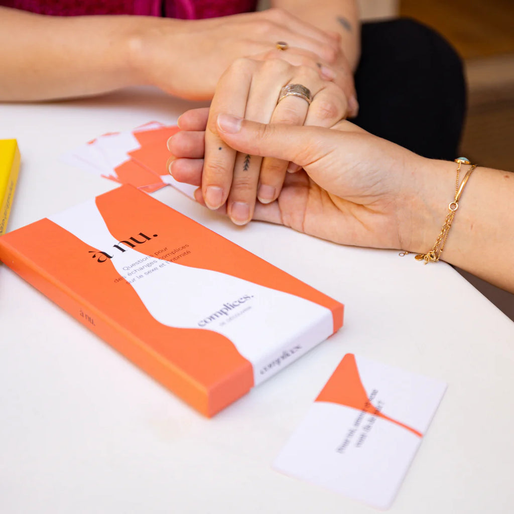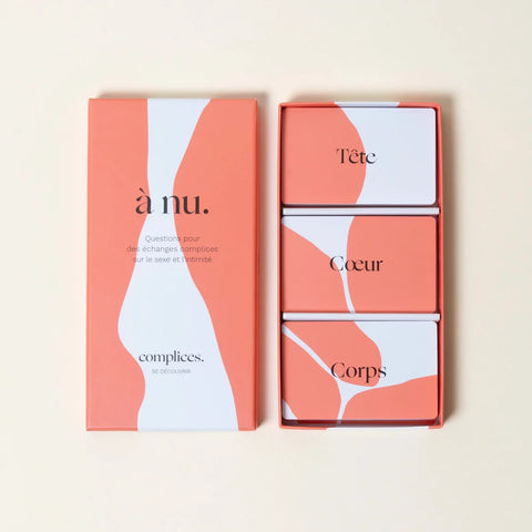 à nu. est une invitation à se rapprocher, par l'échange ou sous la couette. 90 questions pour les histoires naissantes comme pour les plus anciennes, celles sentimentales ou purement physiques, les relations queers, ou les amitiés et plus si affinités... bref, pour toutes les personnes qui couchent ensemble. Ces cartes ne sont toutefois pas le prélude à un instant coquin, mais favorisent des échanges complices sur le sexe et l'intimité. à nu. libère et captive (le corps et l'esprit), révèle les envies au grand jour et rapproche pendant la nuit. Pour oser vous mettre à nu.