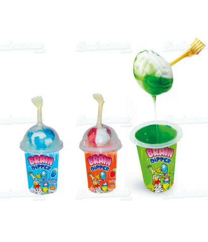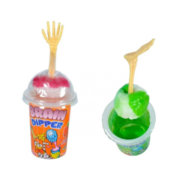 Sucette torsadée géante en forme de cerveau dotée d'un bâton en forme d'os (de bras ou de jambe), à tremper dans un délicieux bonbon gel au goût fruité et acidulé.
