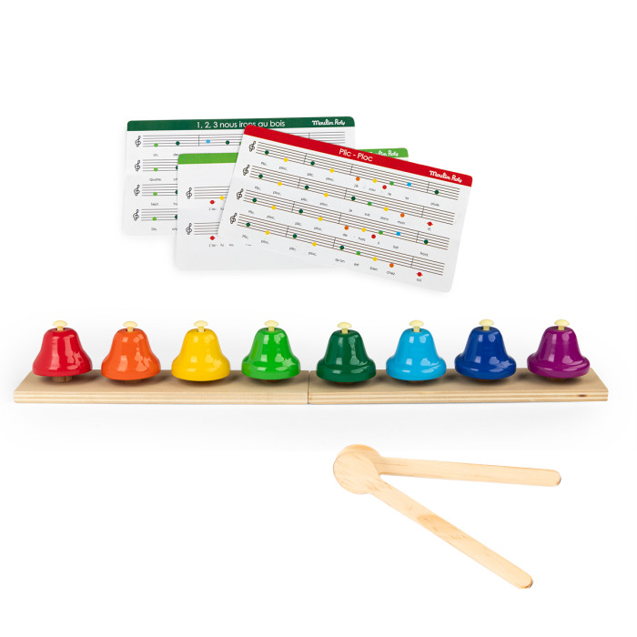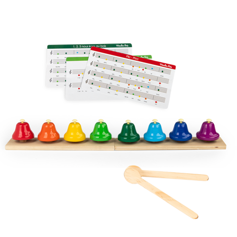 Pour les petits musiciens en herbe ! Développe le rythme, la coordination et l’ouïe grâce au 8 clochettes musicales en métal. Frappe le bord de la clochette et joue de la musique grâce aux partitions glissées à l’intérieur.