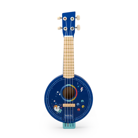Initiez les jeunes musiciens à la magie du banjo ! Cet instrument en bois léger arbore une peinture holographique bleue scintillante, sublimée par les couleurs joyeuses et acidulées de l'univers Puce & Pilou. Équipé de 4 cordes en métal, il offre un son authentique et une prise en main parfaite pour les petites mains. Un compagnon musical idéal pour explorer les rythmes et développer la passion pour la musique dès le plus jeune âge.