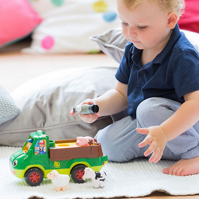 Place le fermier dans le siège à l’avant et le puissant moteur Push & Go de Freddie l'envoie chercher sa vache, son mouton, son cochon et son âne. Le fermier peut également être placé à l'arrière du camion pour nourrir et soigner ses amis de la ferme.