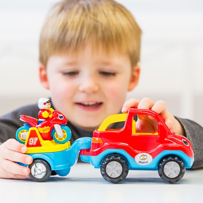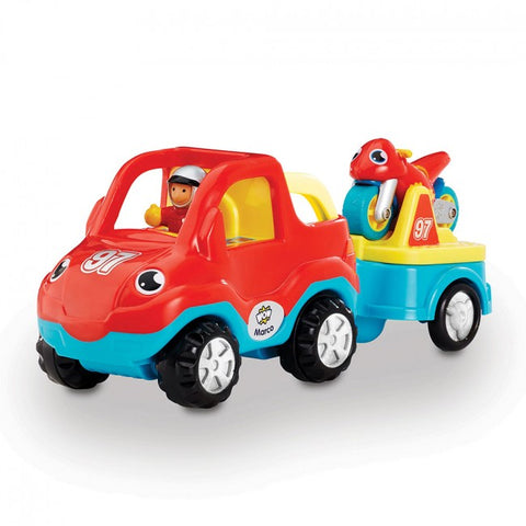 Marco le transporteur de motos est équipé d'un puissant moteur motorisé Push & Go et d'une remorque amovible. Lorsque son pilote de course amovible Play Friend ne gagne pas de courses, il attache son vélo à la béquille de paddock jaune pour s'assurer que les roues sont super propres et que tout fonctionne comme dans un rêve.
