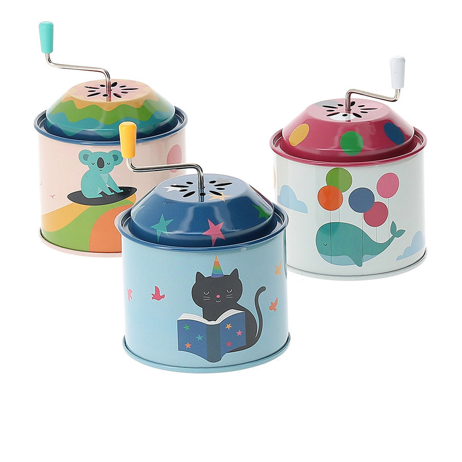 En tournant la manivelle, une douce mélodie s’échappe. Cette série de 3 boîtes à musique en métal, décorées avec charme par Andy Westface, propose des modèles variés : koala, lapin ou requin. Des animaux enchanteurs, portant des ballons ou surfant sur les vagues... Fonctions sans pile, pour un plaisir simple et magique ! 🎶🐾🎈