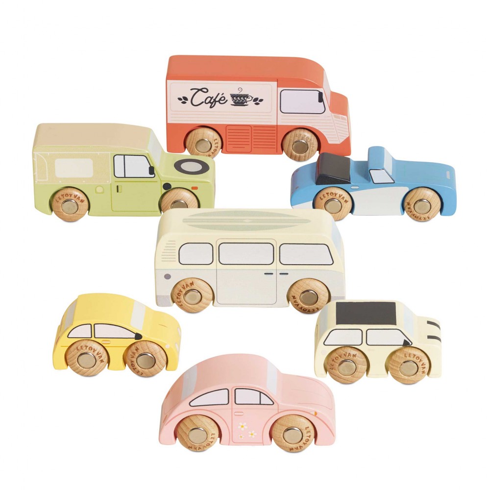 Plongez dans la nostalgie avec ce magnifique set de 7 voitures rétro en bois FSC™. Aux teintes pastel délicates et aux finitions raffinées, chaque véhicule capture l'essence de l'âge d'or automobile.
