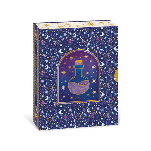 Quelle potion votre petit(e) sorcier(ère) va concocter aujourd'hui ? Grâce à ce kit de création de potions magiques, filtres et autres breuvages n'auront plus de secrets. Le principe de ce kit créatif est simple : on suit les instructions de son grimoire de recettes, on crée ses 10 mélanges dans les jolies fioles, on referme et on étiquette soigneusement ses potions, puis on présente sa collection sur les petits compartiments prévus à cet effet à l'intérieur de la boîte.