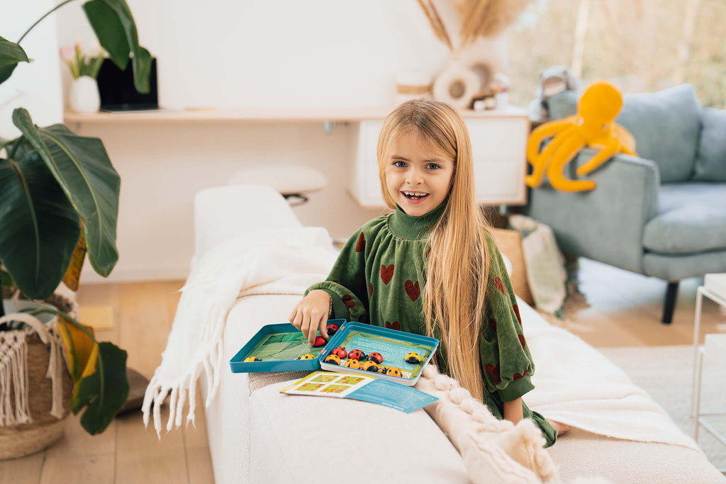 « Coccinelles Demoiselles » est un jeu magnétique de déduction dans lequel vous devrez trouver où poser vos coccinelles sur les feuilles de l’arbre. L’ordre prescrit tient compte de la couleur des trois familles et des valeurs numériques de chaque coccinelle représentées par le nombre de points sur leur dos.