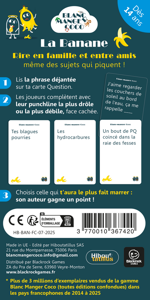 Grâce à des règles expliquées en 1min, on peut se lancer immédiatement dans une partie de Blanc Manger Coco. À l’apéro ou en soirée, c’est le jeu d’ambiance parfait pour rire de tout ! Avec ses 360 cartes, chaque partie est unique.