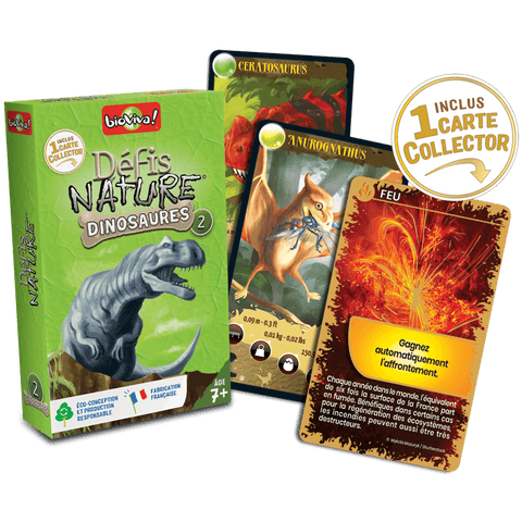 Défis Nature - Dinosaures 2 vous emmène à la rencontre des dinosaures les plus surprenants ! Découvrez les espèces disparues, puis pariez sur les points forts de vos animaux pour collecter toutes les cartes du jeu et remporter la partie. Alors, prêts à relever le défi ?