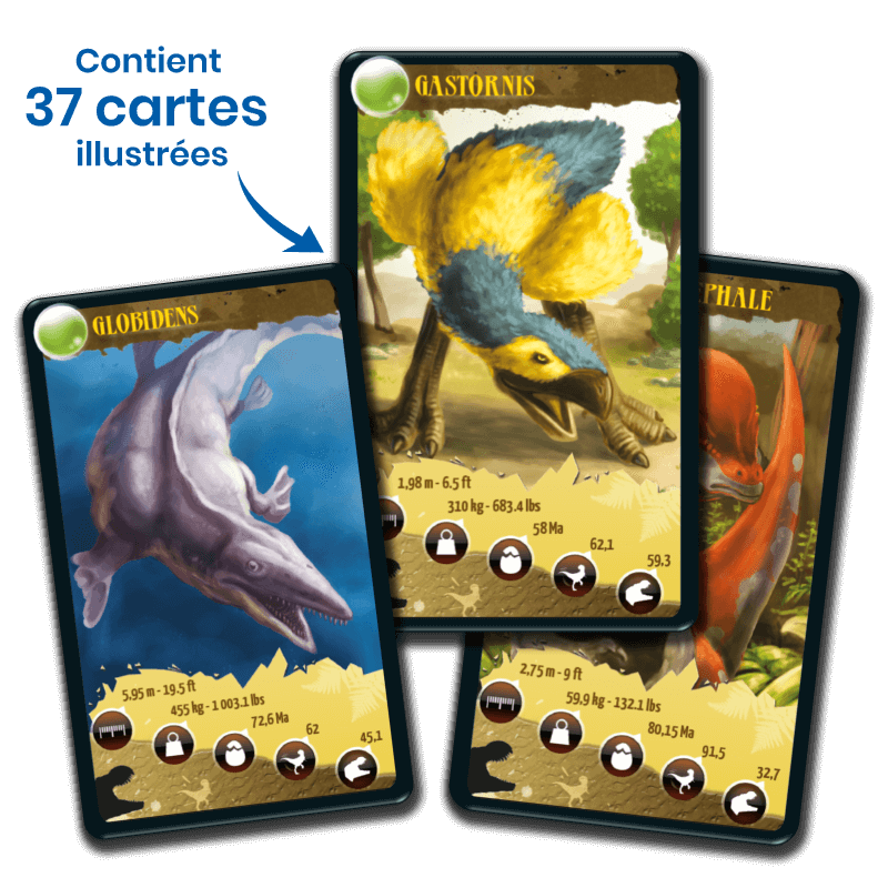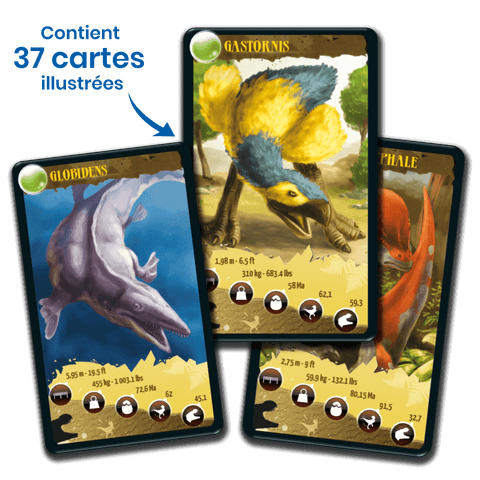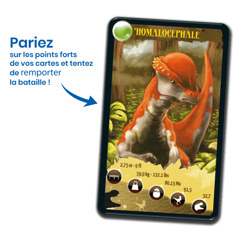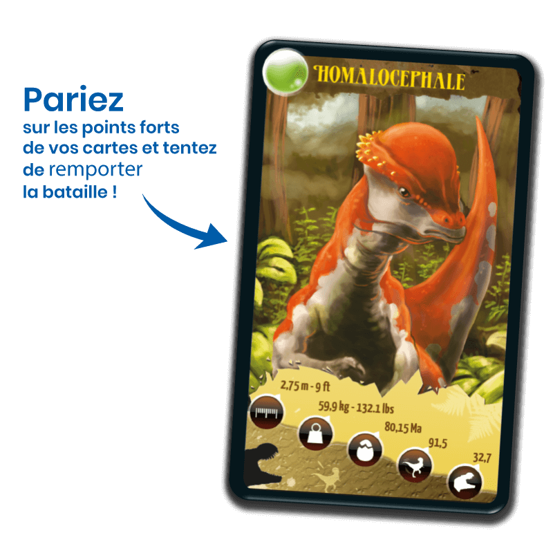 Les enfants de 7 ans et + parient sur les points forts des dinosaures. Le joueur qui possède la plus forte caractéristique remporte les cartes des autres joueurs. Le premier à collecter toutes les cartes du jeu gagne la partie.