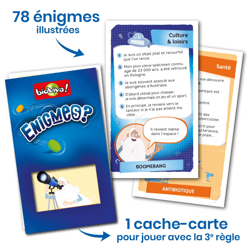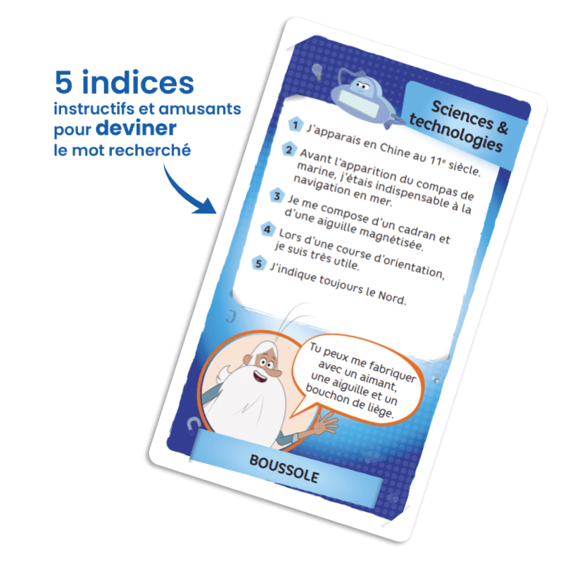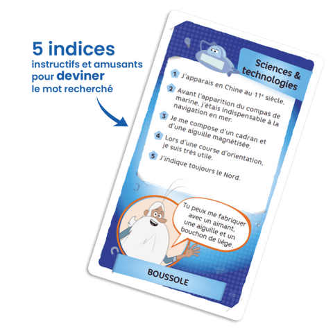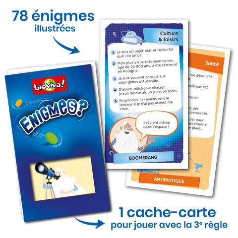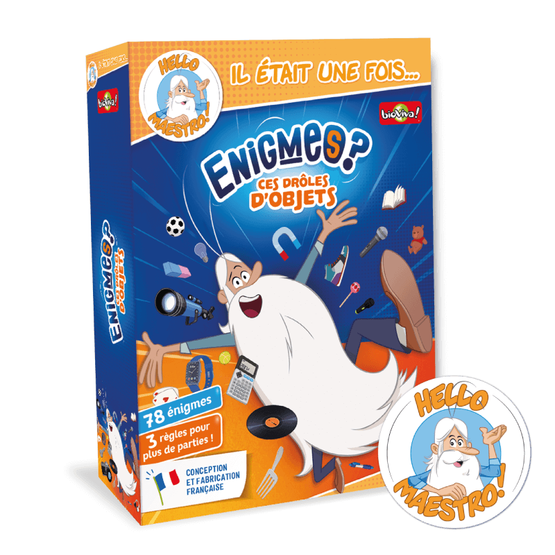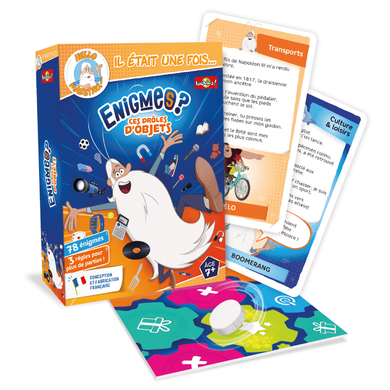 Nouveau ! Règle Expert avec un nouveau plateau : les joueurs tentent de deviner les mots avec moins d’indices, à l’aide de l’illustration ou de l’information de Maestro sur la carte. Ils lancent le jeton sur le nouveau plateau afin de connaître les indices à énoncer. Ce plateau est utilisable avec tous les jeux de la collection Enigmes !