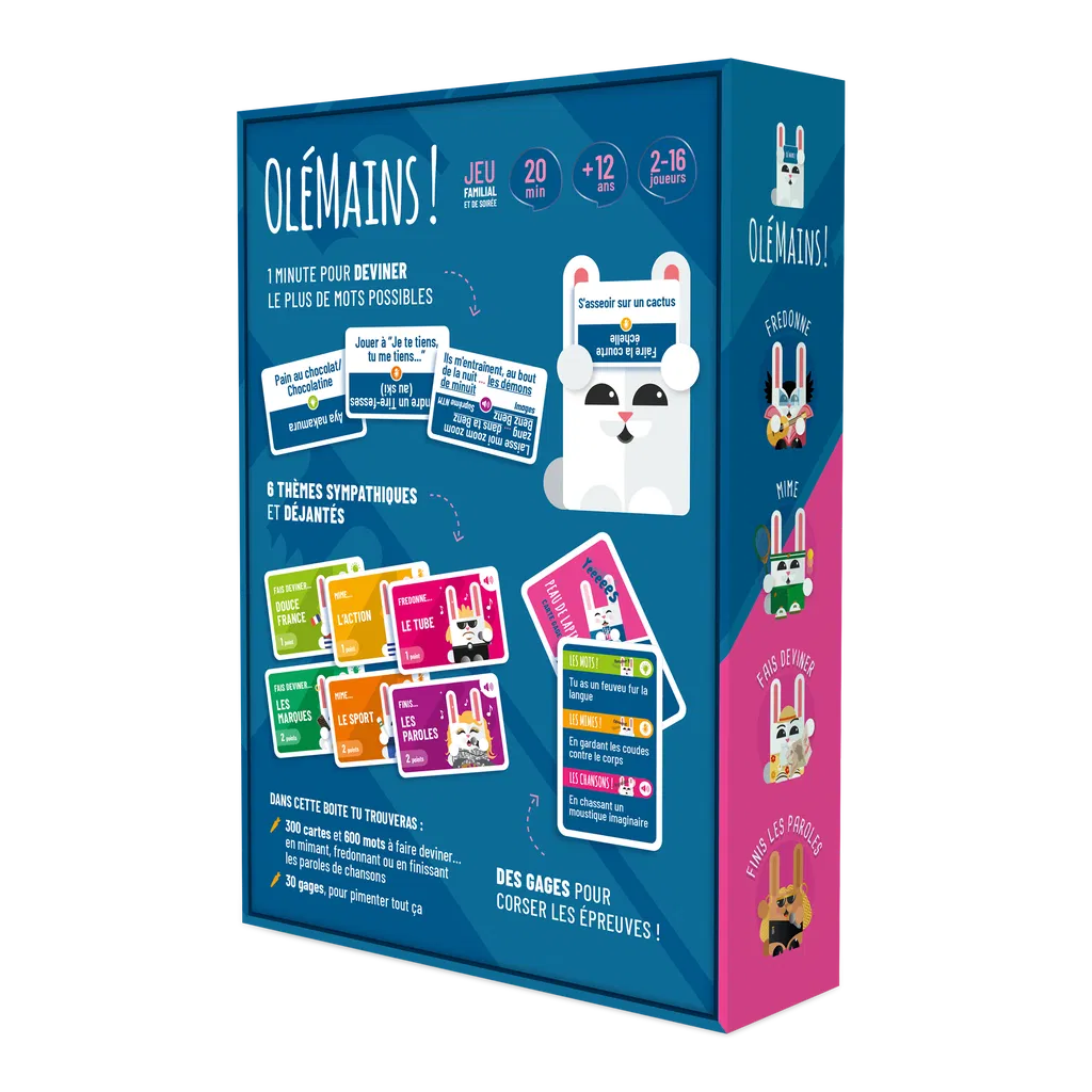 OléMains revient en force ! Ce jeu hilarant mêle mimes, devinettes et chansons pour des moments de pur divertissement en famille ou entre amis. Avec 6 thèmes farfelus, des défis d'une minute pour deviner un maximum de mots et des gages pour pimenter le jeu, c'est le cocktail parfait pour des fous rires garantis.